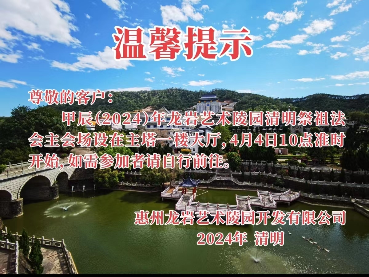 1、清明祭祖活动时间:2024年4月4日星期四 2、清明祭祖活动地点:主塔一楼祭拜大厅 3、上午10:00--10:30祭祖仪式 4、上午11:30--12:30午餐(盒饭各部门在饭堂领取) 5、中午12:30--15:00(督导园区自由祭拜人员防火安全) 6、下午16:00(善后工作)