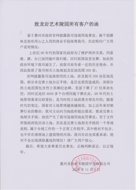 惠州龙岩艺术陵园开发有限公司,以改革殡葬文化、革新殡葬礼仪服务为己任,以诚信、积极、永续、创新为企业信条,公司在这样的信念下建立,并将在殡葬事业道路上坚定地走下去。 惠州龙岩艺术陵园开发有限公司位于地处惠阳沙田镇长安大道风景林地,四周有几千亩梨树园及绵延不断,距市区五公里,交通便利,地理位置优越,系人生归属之风水宝地。现有老红军、革命烈士、老干部、港澳、台同胞等安息于此。每逢清明期间,墓区里散发着桃花、梨花等果花的芳香,安慰着祭拜的亲人,抚慰着安息的亡灵。 现设计为祭奠、旅游、观光、休闲为一体的生态式陵园。